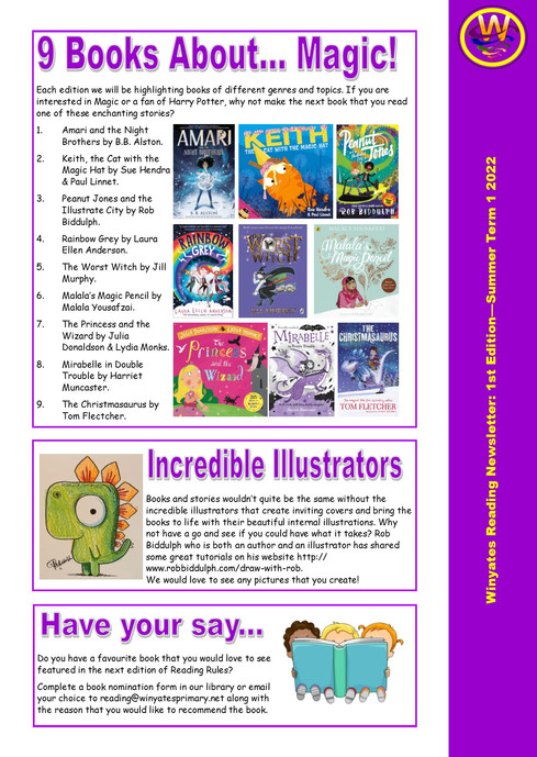 Today we are launching our first half termly edition of Reading Rules! This is our first every school newsletter dedicated solely to reading, so why not dive in? You will find out about exciting new releases, book recommendations, perfect picture books and much, much more! Finally, we are looking for you to contribute to future editions by sending your recommendations to reading@winyatesprimary.net. Happy Reading!